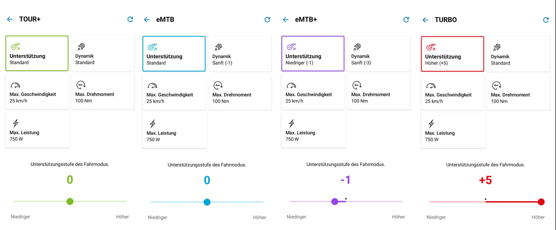 Im aktuellen Setup fahre ich in allen Modi mit 100 NM und 750 W, also voller Leistung.  Die „Unterstützung“ bestimmt, wieviel der Motor selbst „mitschiebt“. Die volle Leistung (100 NM, 750 W) kommt also nur zu tragen, wenn man selbst richtig Leistung bringt. Solange man die Unterstützung niedrig lässt, kostet das nicht mehr Strom, bringt aber ein sehr dynamisches Fahrgefühl. Viel Eigenleistung erzeugt viel Motorleistung. Das motiviert und man bleibt länger als sonst in einer niedrigen Unterstützungsstufe. Auch bei kurzen Rampen braucht man nicht in die nächste Stufe schalten, sondern tritt kurz härter. Dadurch fahre ich jetzt länger und öfter in meinem schwächsten Modus, dem Tour+. Damit habe ich sogar den Akkuverbrauch gesenkt trotz voller Leistung.