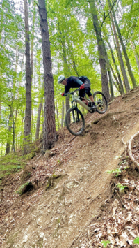 So gut ein 29“ Hinterrad und lange Kettenstreben auch bergauf funktionieren, ich bin grundsätzlich kein Fan davon. Ein kleineres Hinterrad hat zwar weniger Traktion, bietet aber bei Bergabstufen mehr Bewegungsspielraum nach hinten und lässt das Heck schneller ums Eck gehen. Speziell dann, wenn die Kettenstreben kürzer sind. Dazu sollte sich auch das Vorderrad leichter anheben lassen, was für mich ein wichtiges Kriterium ist. So weit die Theorie.